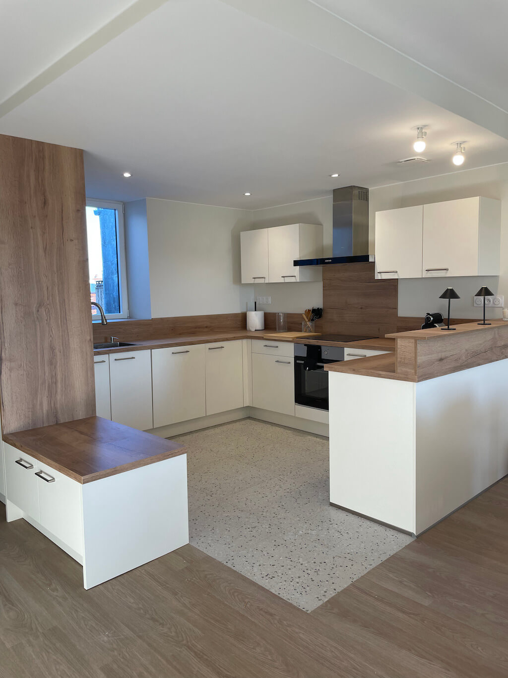 - Cuisine et pièces de vie : pose d’une grande cuisine moderne et installation d’un sol à lames PVC dans les pièces de vie et chambres pour un entretien facile et un style moderne.