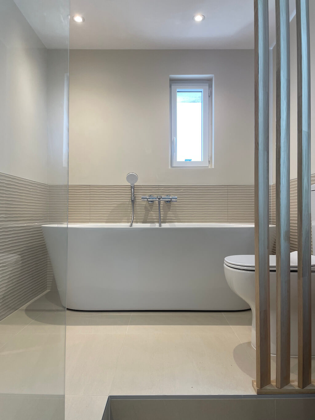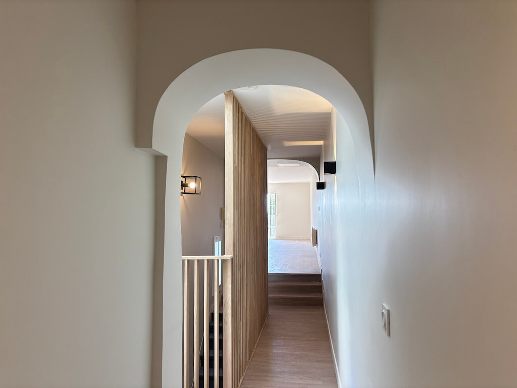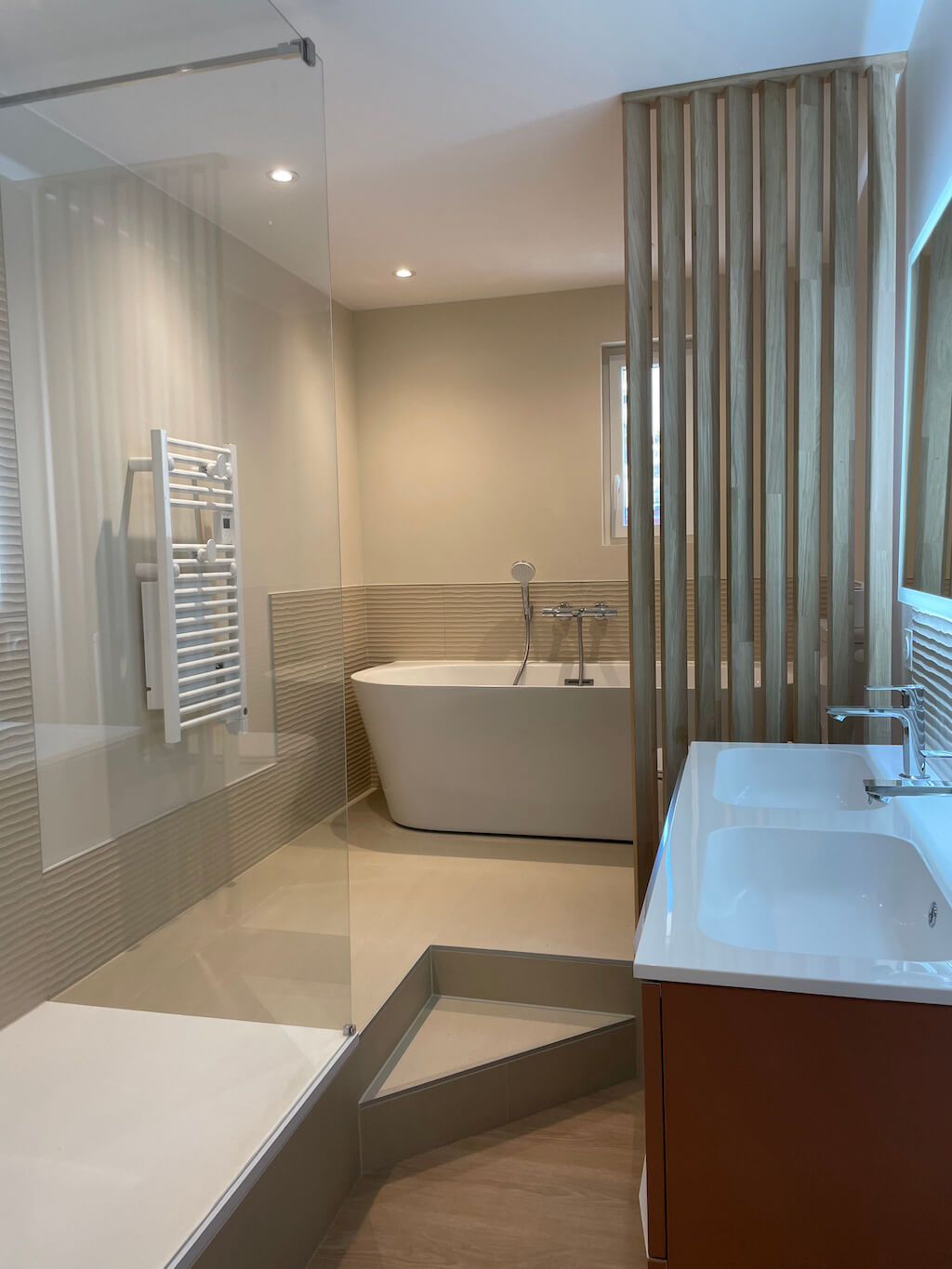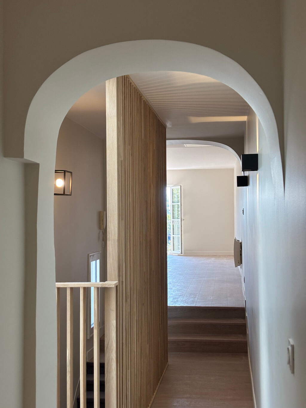 - Détails sur-mesure : création et installation de claustras en bois sur mesure pour la cage d’escalier et la salle de bain, alliant esthétique et fonctionnalité.