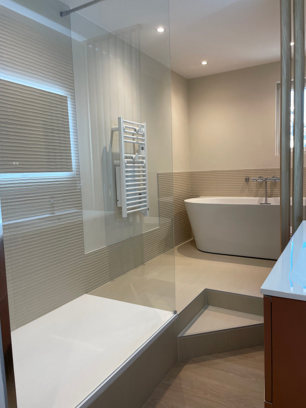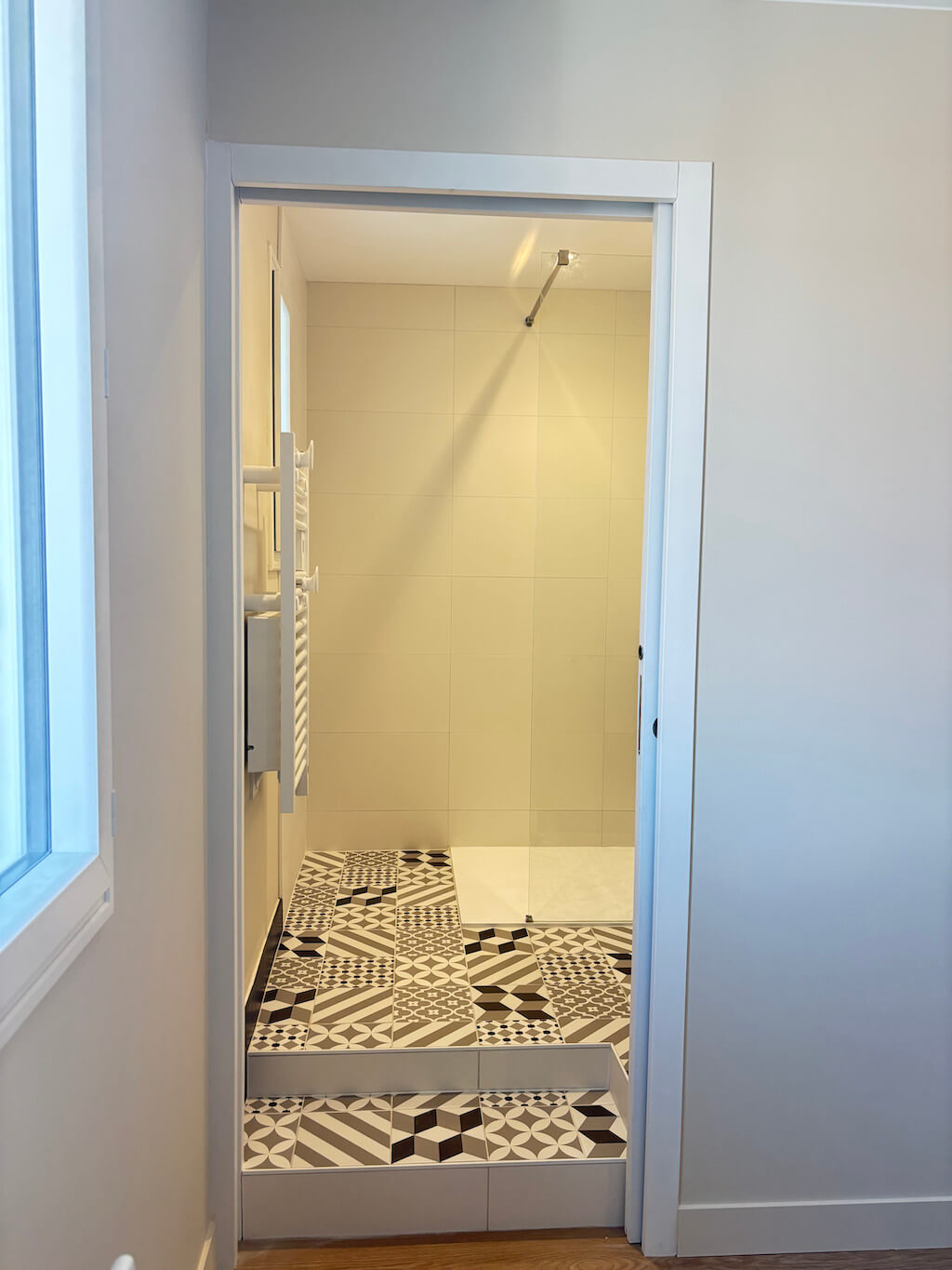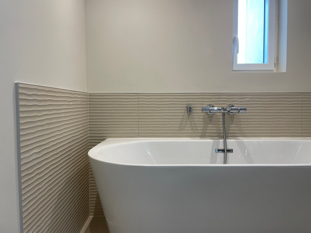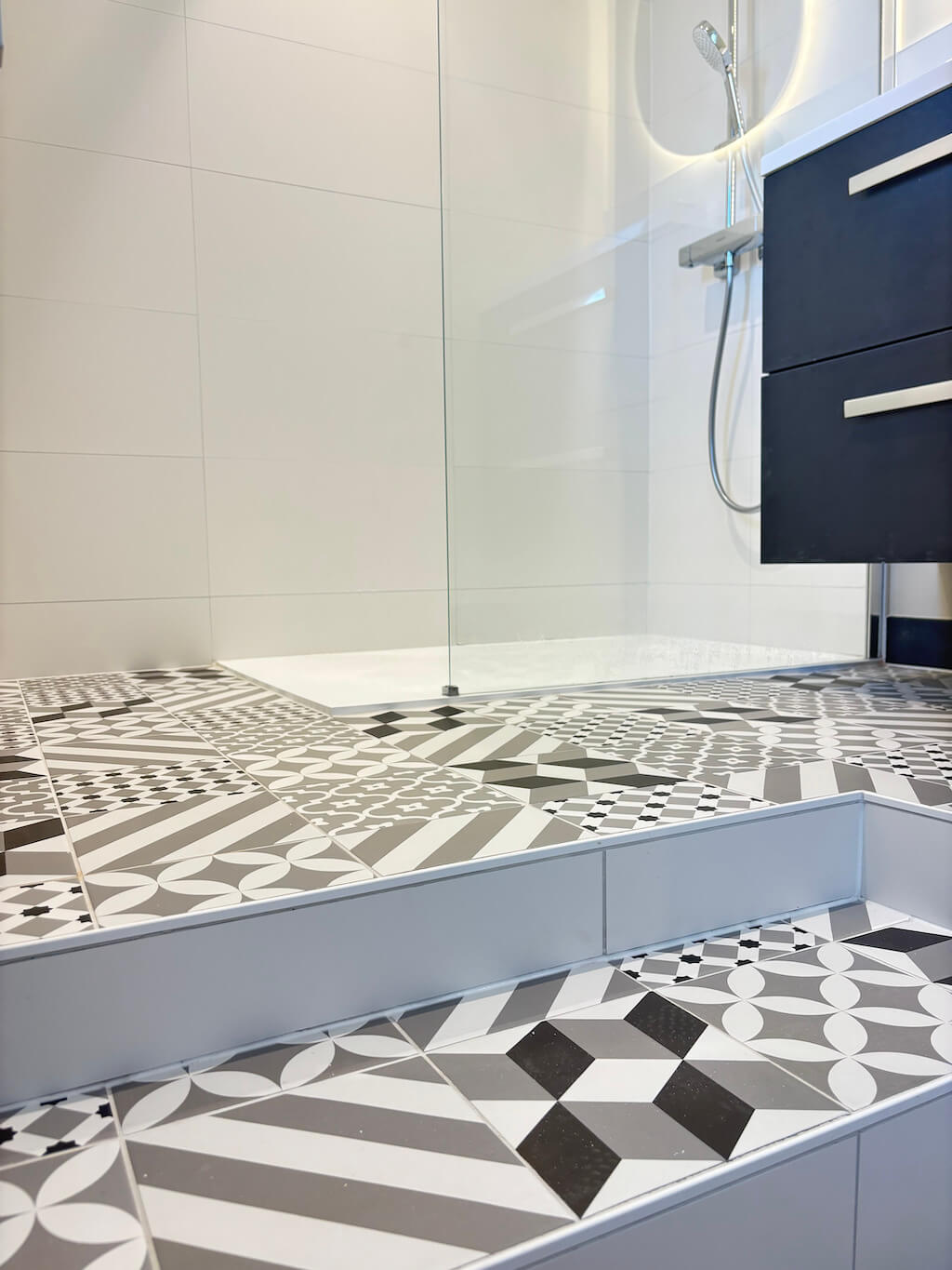 - Salles de bains et salles d’eau : création et aménagement de 2 salles d’eau et 1 salle de bain, avec installation complète de plomberie, pose de carrelage et réalisation de 3 estrades en bois pour surélever les zones d’eau.