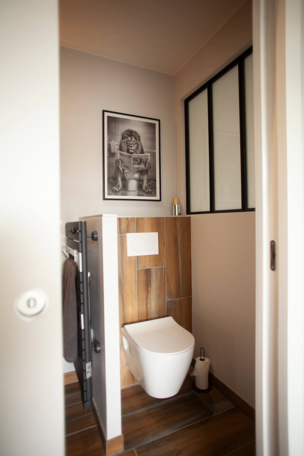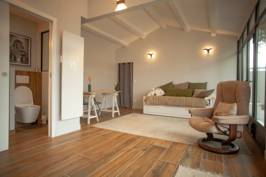 - Revêtements et finitions : pose d’un carrelage effet bois au sol, peinture des murs et plafonds pour un rendu moderne et chaleureux.